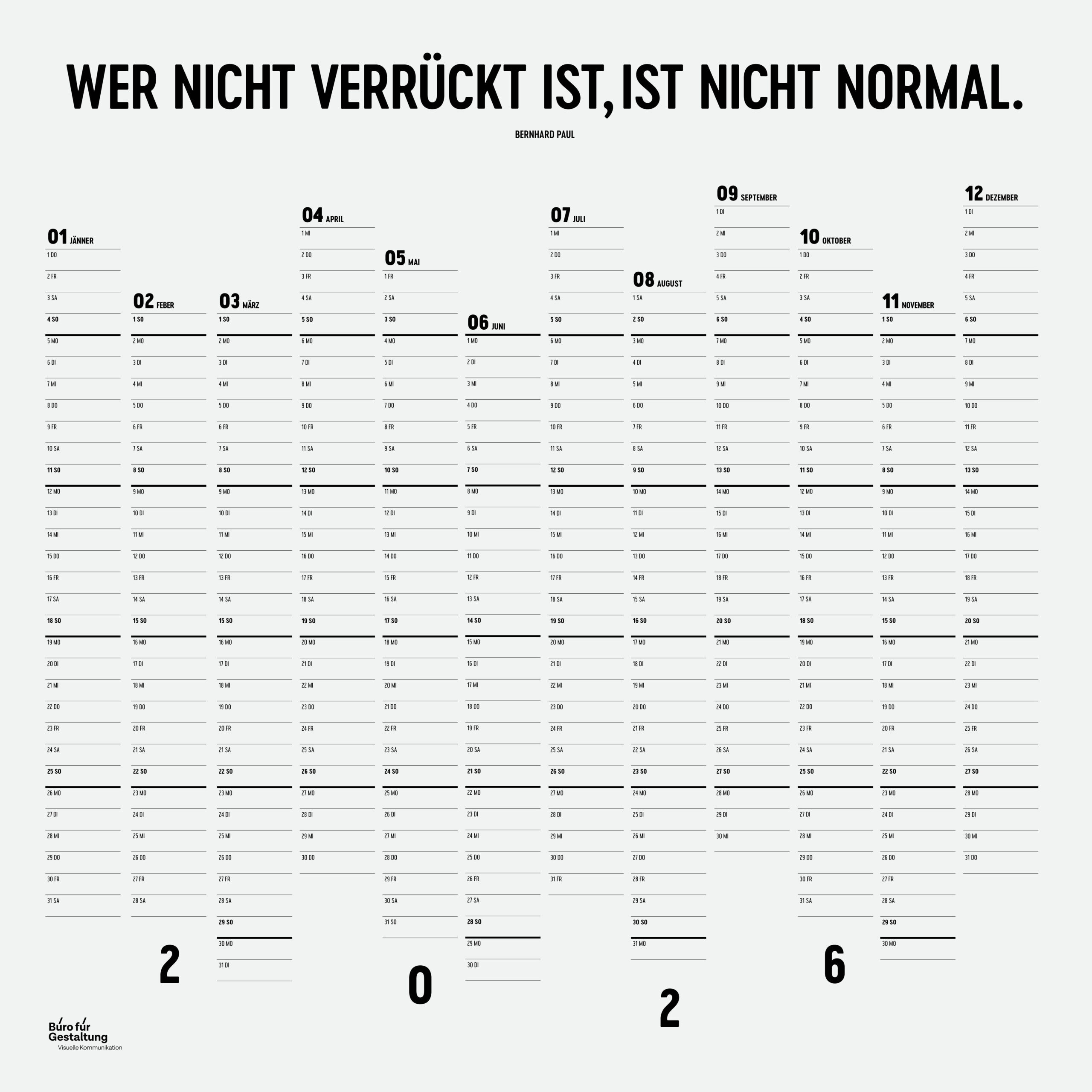 Dazu gibts einen Jahreskalender, der hier als Druckdatei zum Download zur Verfügung steht.